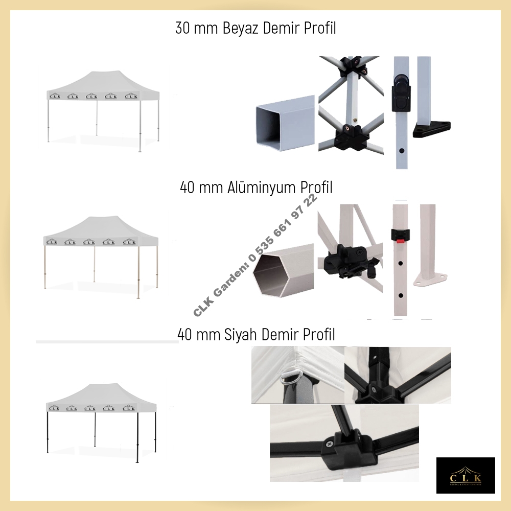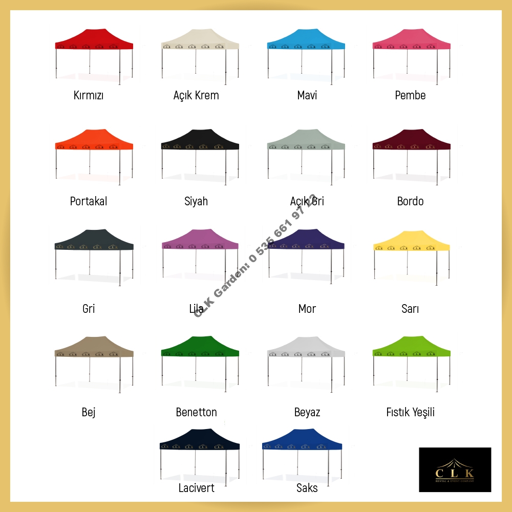 İmalatçı firma CLK TİCARET güvencesi ile %100 su geçirmez Oxford kumaş ile üretilmiş, branda ve iskelet garantili katlanabilir gazebo çadırları.